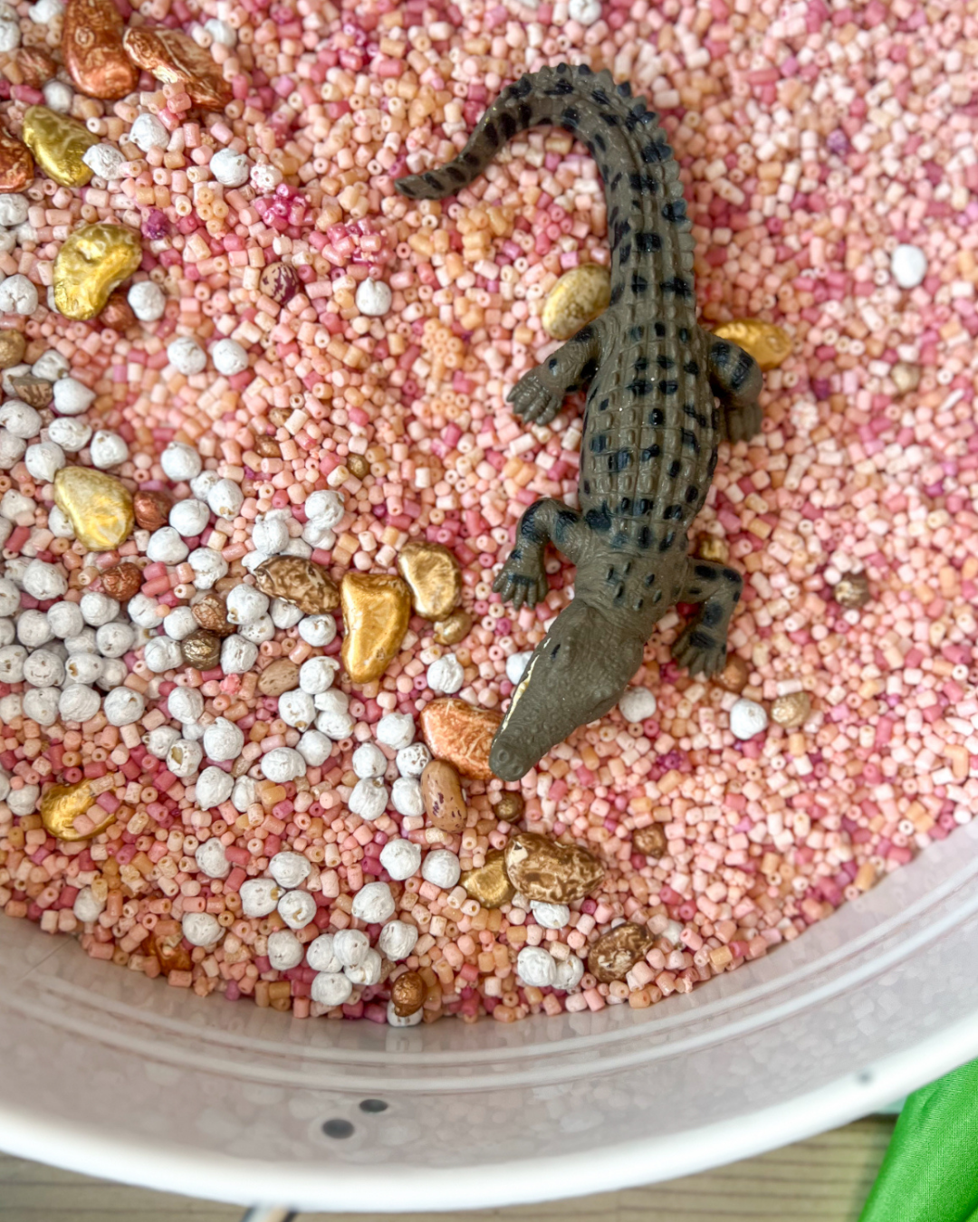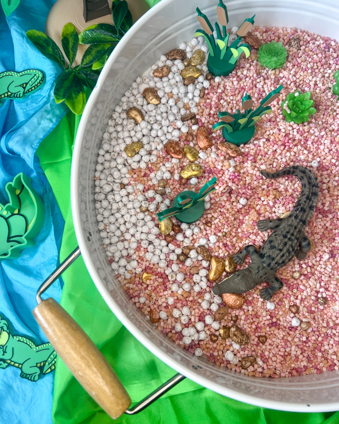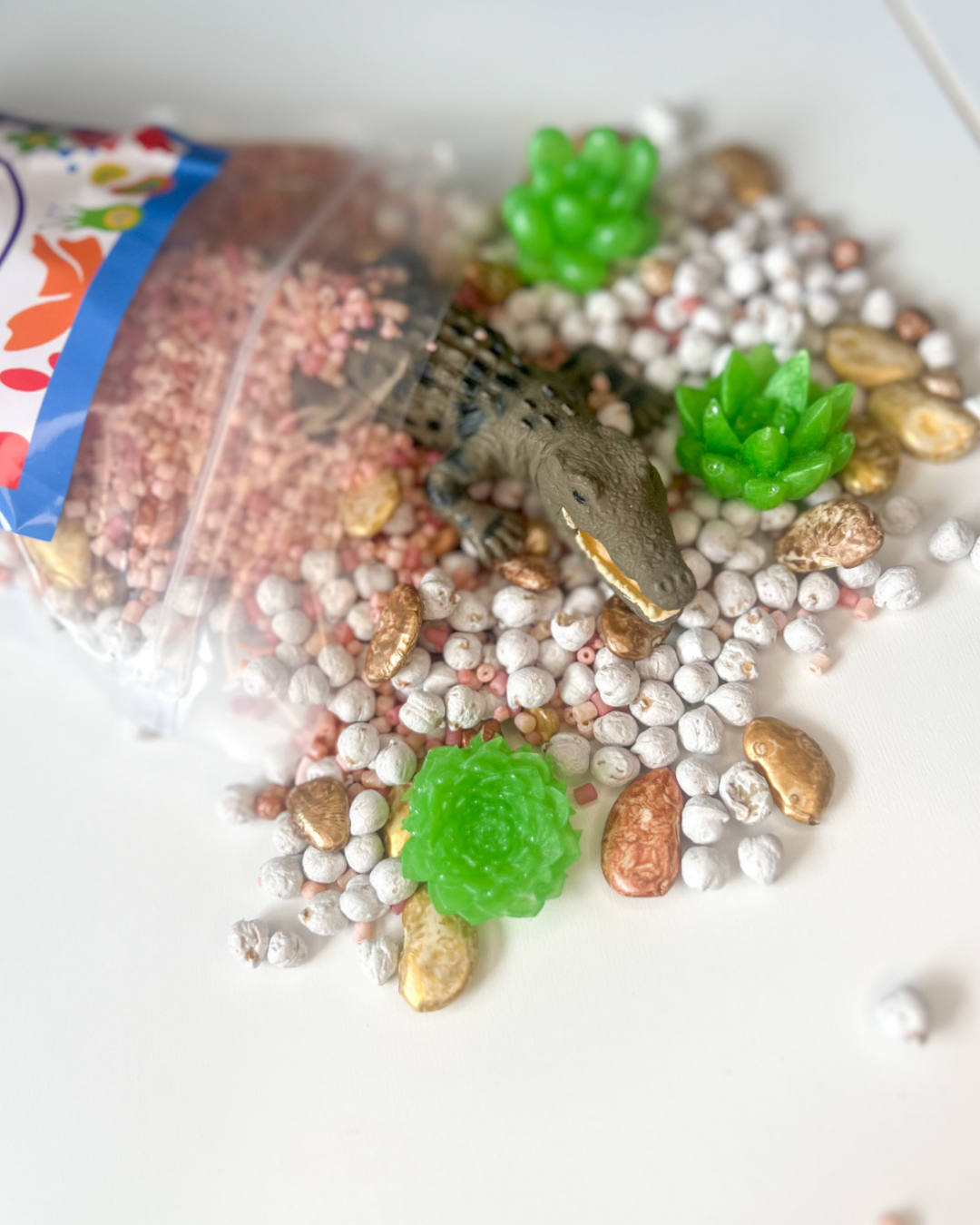 Then look no further than our incredible sensory bases. Bright, sparkly, colourful and a whole lot of fun. Whether it be scooping, pouring, sifting or shaking these are a sensory delight for our little loves. This base comes with resin succulants and a large science and nature crocodile (valued at $7.99)