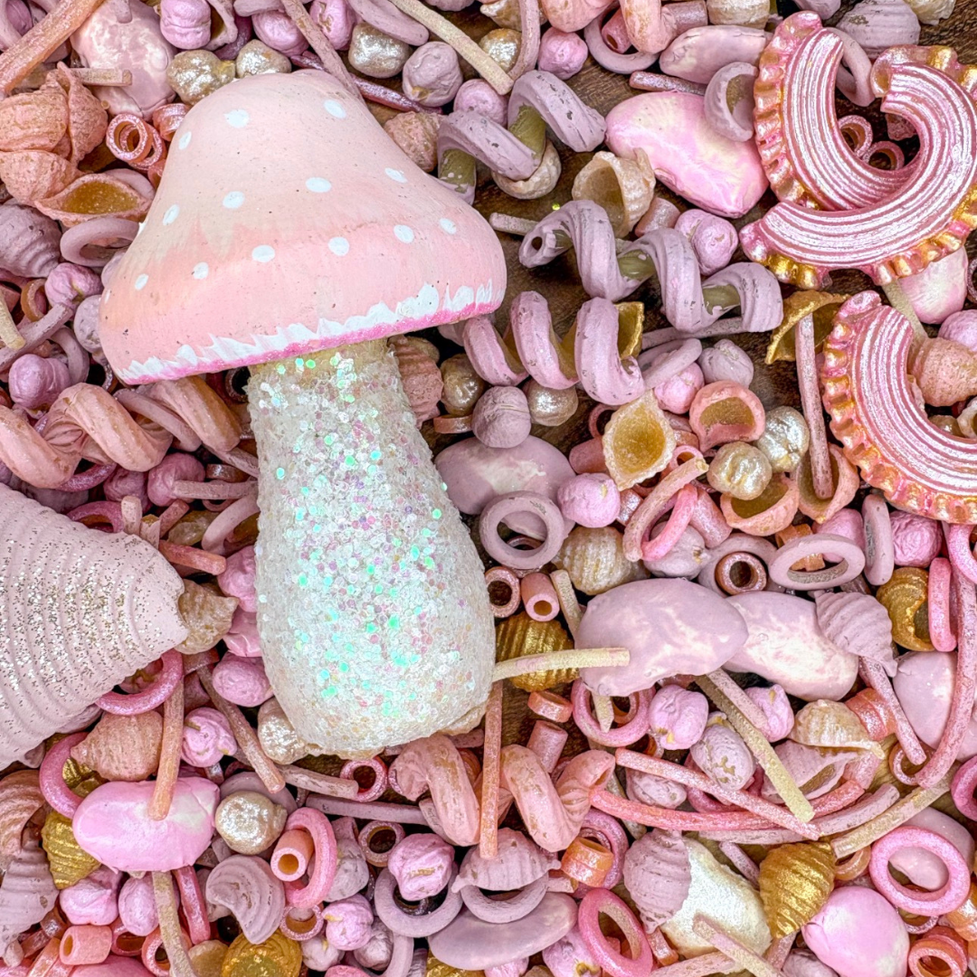 Ingredients: - Pasta, Legumes, Glitter, Non-Toxic Paint and Dyes and each bag contains a Hand Painted Wooden Mushroom.