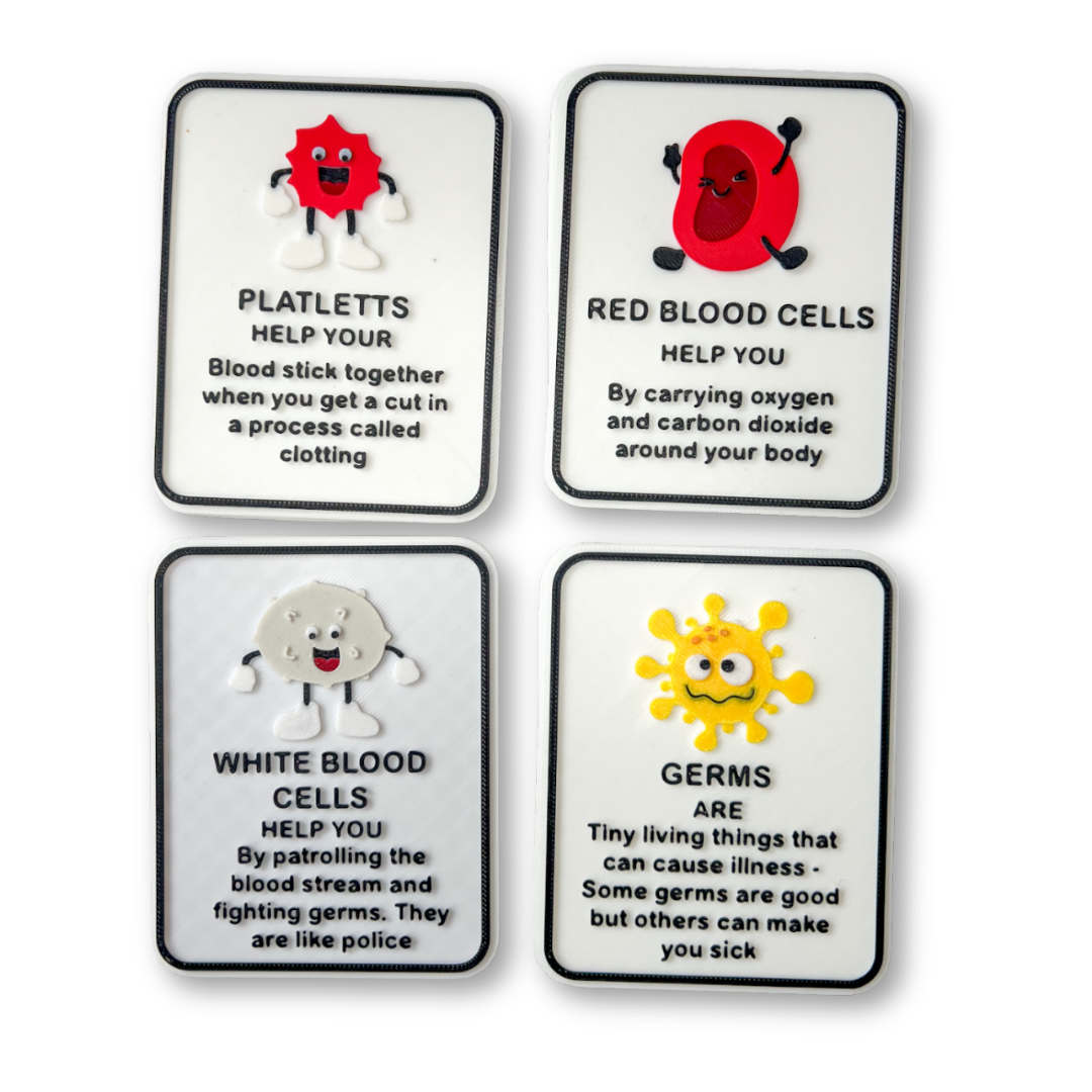 Each pack contains 4 flashcards (White blood cell, red blood cell, germ and platelet).