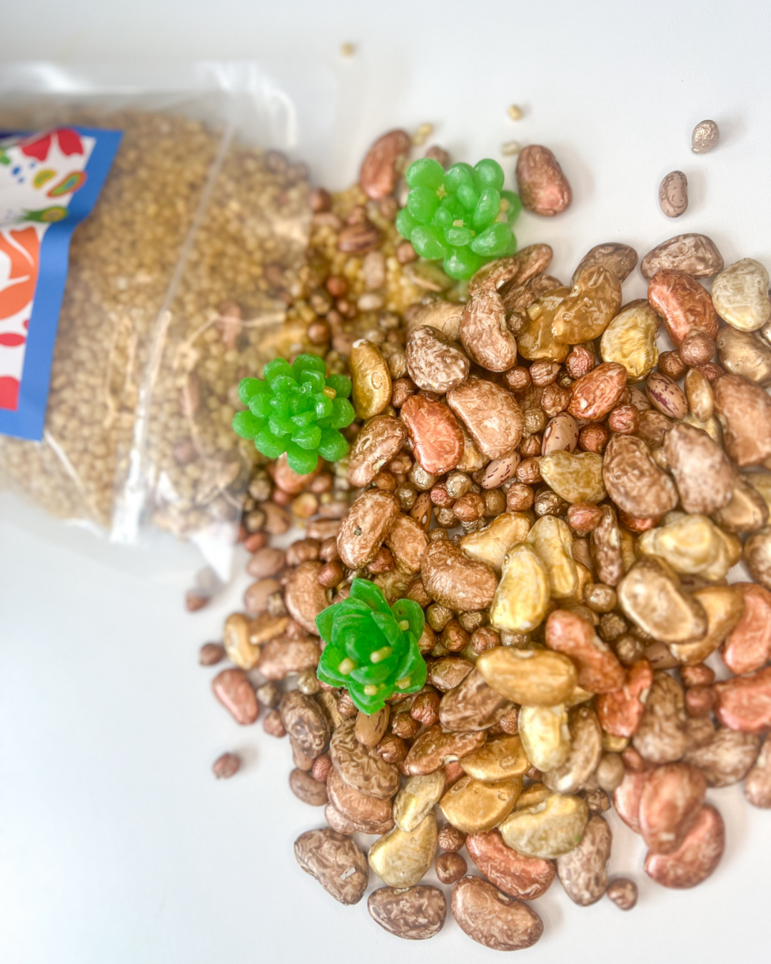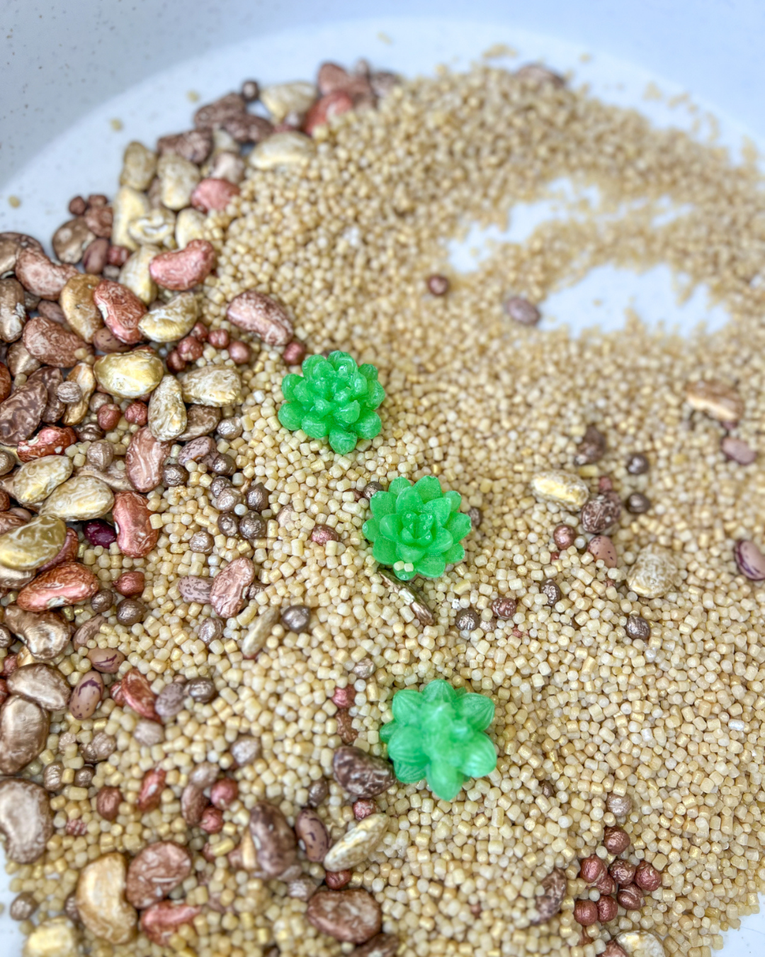 Then look no further than our incredible sensory bases. Bright, sparkly, colourful and a whole lot of fun. Whether it be scooping, pouring, sifting or shaking these are a sensory delight for our little loves. This base comes with resin succulents.